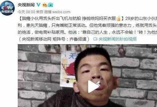 【脑瘫小伙用舌头折出飞机与航船挣钱给妈妈买衣服】29岁的山东小伙高广利,患先天脑瘫,只有嘴能正常活动。但他凭着顽强的意志力,练就用舌头折纸的绝活,做电商补贴家用。他说:“靠自己的人生,永远不会输!”转!为他加油!(央视新闻移动网矩阵号:齐鲁频道)