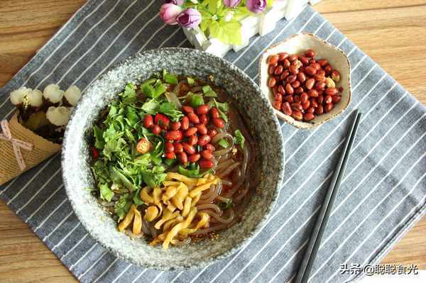 【食材准备】红薯粉丝1棒、葱1根、大蒜5瓣、小米椒适量、香菜适量、芥末适量、花生适量、生抽2勺、盐1勺、糖2勺、陈醋3勺、五香粉适量、,其包括适量的胡椒粉和适量的黑胡椒粉。