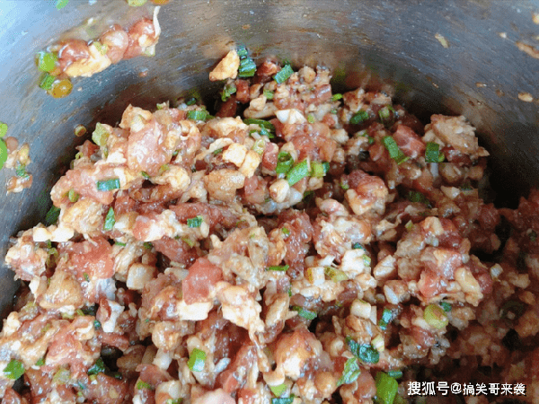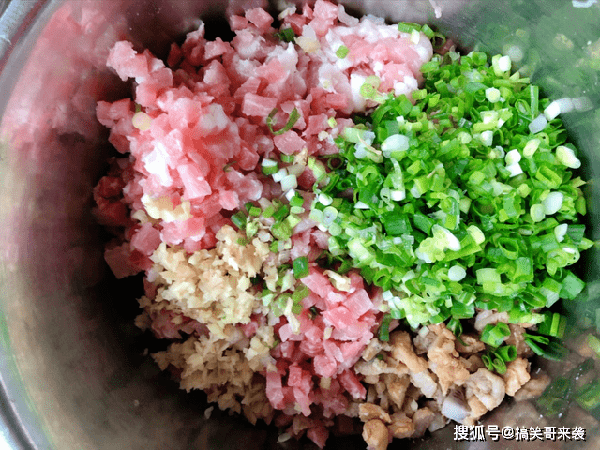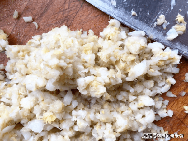 5、准备半根大葱,一块生姜,剁成葱姜末,一起加入到馅料中,搅拌均匀。