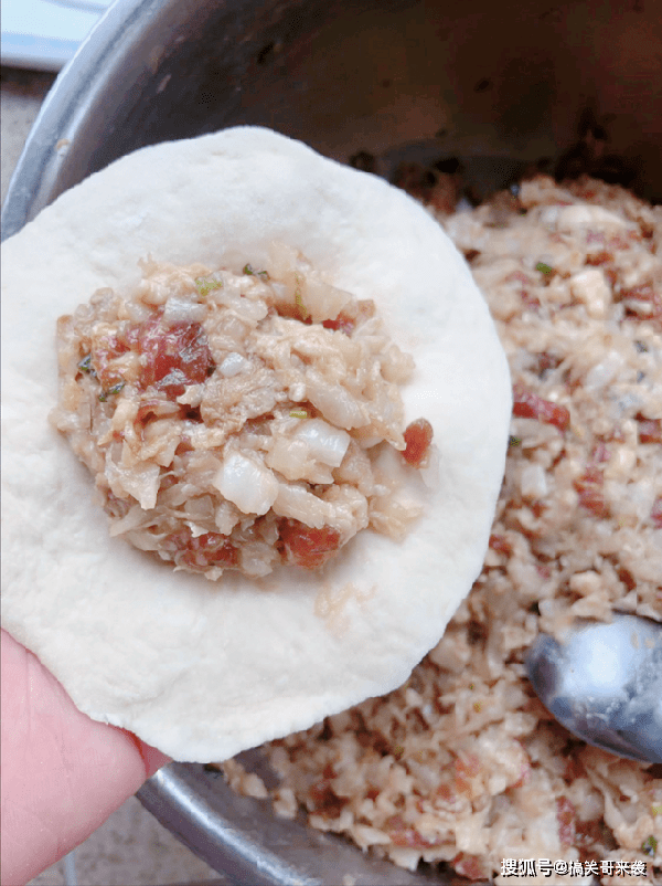 8、趁着这个时间,可以和面,准备包子皮,等准备工作做好以后,再端出包子馅,按照自己的手法,捏紧收口,包成包子的形状。