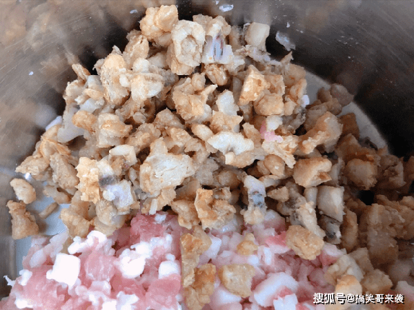 4、再放入适量的猪油渣,猪油渣就是炸完猪油的残渣,硬硬的,脆脆的,焦香可口,它能吸收多余的水分,变得饱满起来,让整个包子馅鲜香可口,美味无比,猪油渣可以直接吃,也可以炒青菜,那味道老香了。