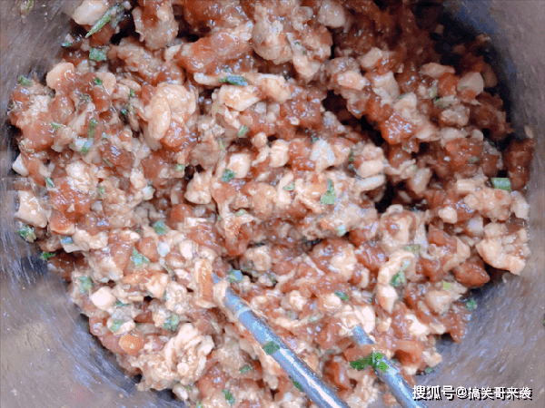 7、最后结尾的时候,准备少量的清水,少量多次,边倒边搅,让肉馅吸收干净,这样看起来水润一些,不会干柴,纯净水就行,接下来放进冰箱冷藏中,腌制半个小时。