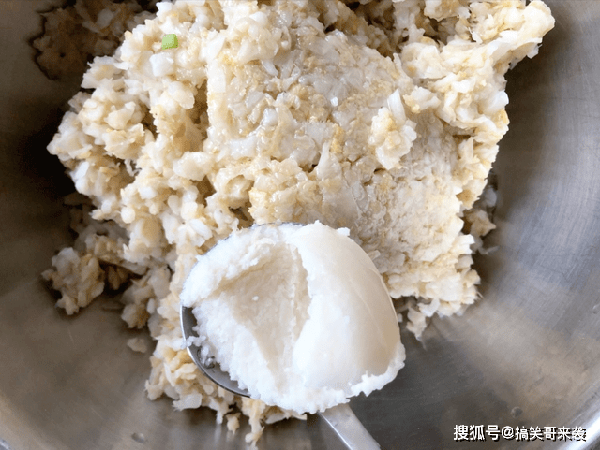 3、攥干水分的酸菜,放在一个大盆中,先舀入一勺猪油,猪油都知道,是用猪板油熬出来的,雪白色的油脂,有了它的存在,包子馅肯定香,把猪板油融化开,搅拌均匀。