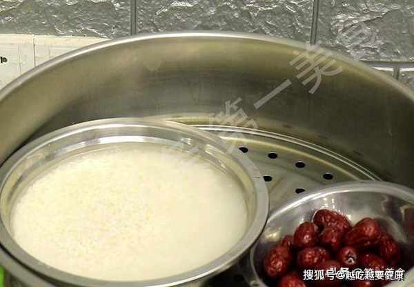 往江米盆中倒入适量的水,水量没过一指即可,把红枣和江米放入蒸锅中,盖上锅盖,中火蒸制半个小时即可,把江米蒸熟。