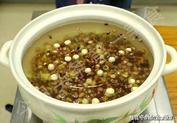 准备一个砂锅,加入半锅水,加入少许碱面,这样豆子更容易煮面,把洗好的豆子都放进去,先大火烧开再转小火炖煮,倒入少许清水,煮这个八宝粥不能一直沸水咕嘟,否则豆子的表皮很容易破。