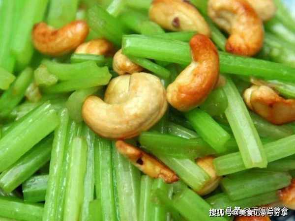 1、芹菜摘掉叶子,清洗干净切成小段。腰果去掉外壳,清洗干净即可。