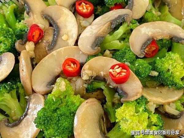 3、起锅烧油,油热后放入蒜末爆香,再放入口蘑翻炒,炒软炒出汁后,放入西兰花翻炒几下。