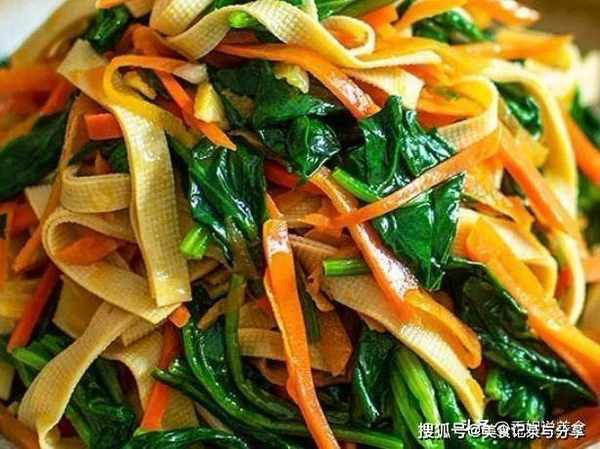 3、起锅烧油,油热后放入蒜末爆香,再放入胡萝卜丝翻炒,炒软后放入豆皮和菠菜翻炒均匀。