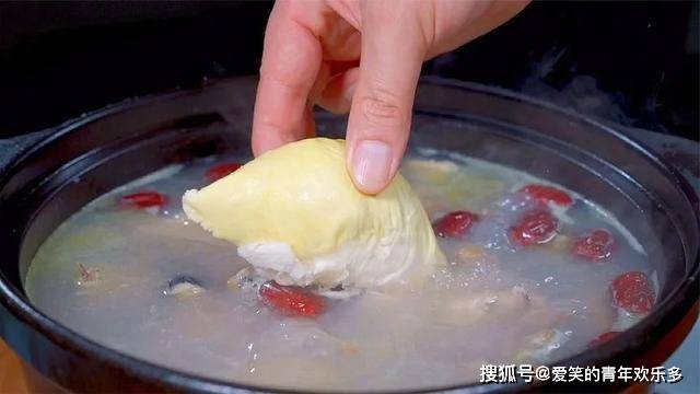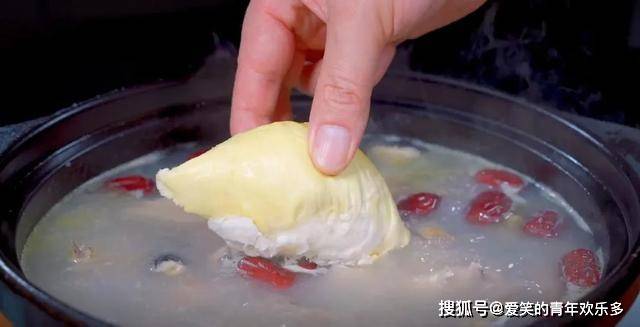 12.时间到,打开盖子,放入一块榴莲肉,适量食盐和鸡精调味,继续炖5分钟。