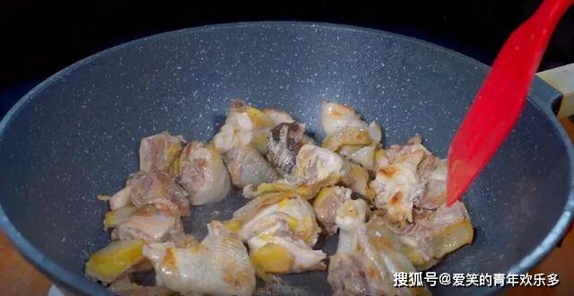 8.起锅烧油,油热倒入鸡肉翻炒,炒至微微发黄。