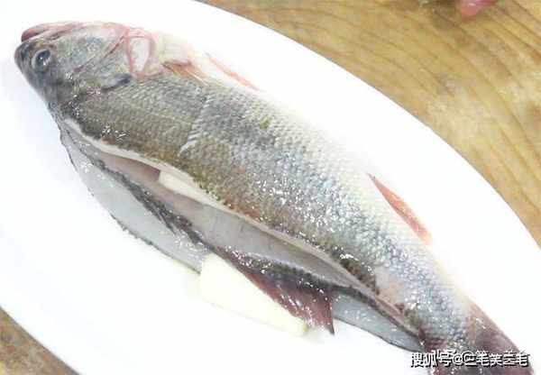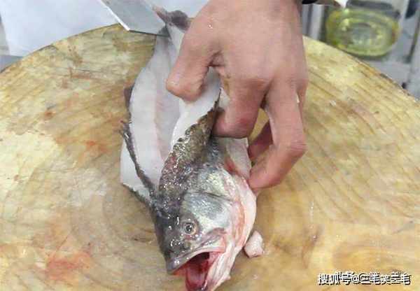 准备鲈鱼一条,已经提前宰杀好了,用刀从鱼背贴着鱼骨划开,不划透,尽量别破坏鲈鱼的鱼身影响美观。
