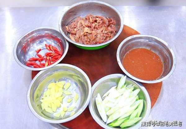 切点葱丝、青红椒丝、葱段、姜片备用。
