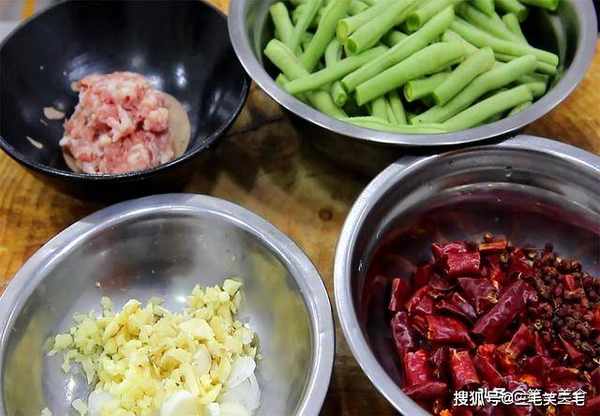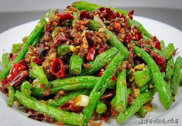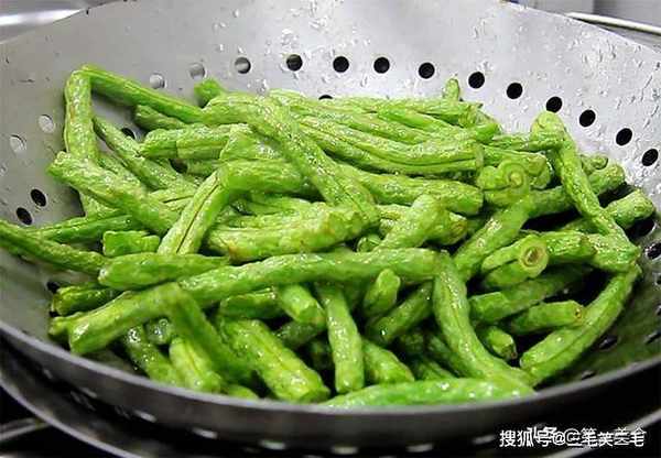 锅内烧油,油温5成热时把四季豆放入锅中,大约炸1分钟,四季豆表面起满虎皮斑,颜色返青时倒出控油,一定要确保四季豆炸熟以后再出锅,以免引起食物中毒。