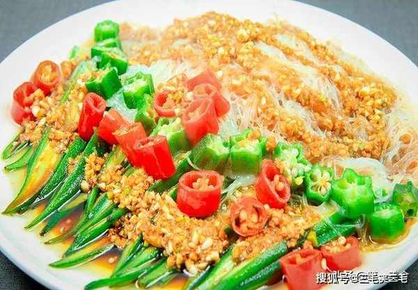 秋葵蒸好以后把它端出来,均匀淋上调好的料汁。