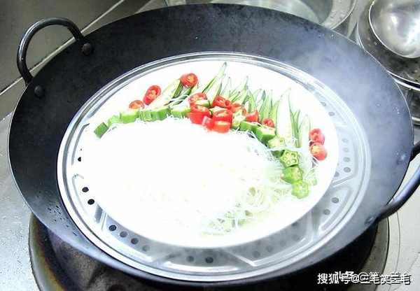 锅内烧水,放上篦子,水烧开以后把秋葵放入锅中蒸10分钟,把秋葵和粉丝蒸熟。