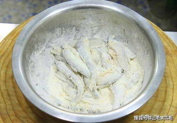 腌好之后在盆中放入面粉50克,抓拌均匀,让小白条均匀裹上面粉,这样炸的时候不会炸锅,而且炸出来特别焦酥。