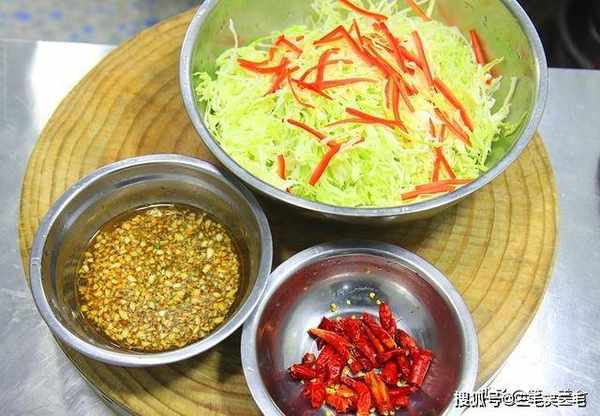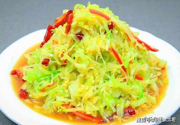 锅内加入植物油20克,油温烧到七成热时起锅,把热油浇在干辣椒上,爆出料头的香辣味,把包菜控干水分倒入盆中,浇上爆香的料头,倒入调好的料汁,颠盆拌匀后即可,一道清脆入味的炝炒包菜丝就做好了。
