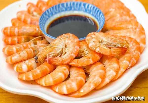 鲜虾冷却后摆放在盘中,整个煮制过程不需要放任何调料,尤其是食盐,盐水煮虾肉容易失水,鲜味和鲜嫩感都会受影响,蘸着酱汁吃才美味,一道原汁原味的白灼虾就做好了。