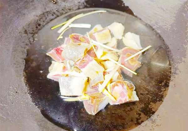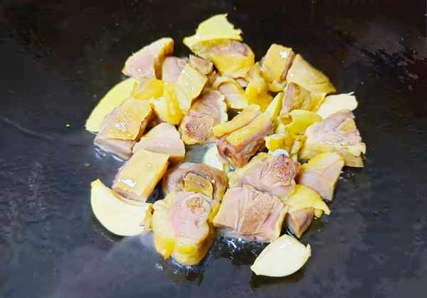 ⑤热锅冷油,倒入腌好的鸭肉,中小火翻炒。一直炒腊鸭的表面水分,把鸭皮里的肥肉炒出来。加入料酒、生抽去腥,再翻炒片刻。加姜、蒜去腥增香。