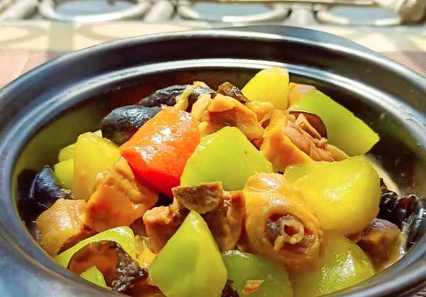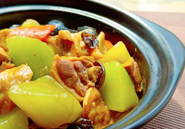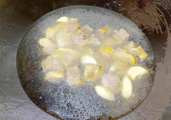 (3)将腊鸭先焯去腥味,再炒一会。没有这一步,腊鸭就会有腥味和肉味。记得腊鸭需要炖一会,才能炖出咸香。