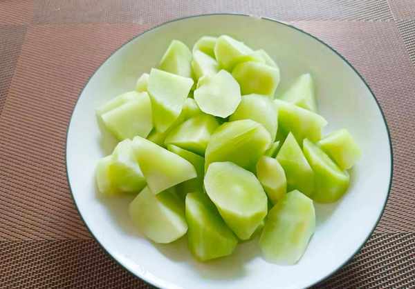 ①我们用削皮刀把生菜外面的皮去掉,再去掉表面的白筋,然后擦洗干净,切成滚刀块装盘。