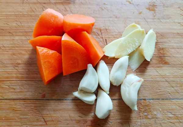 ②胡萝卜去根,去皮洗净,切成滚刀块。大蒜和生姜去皮洗净,切成小块待用。