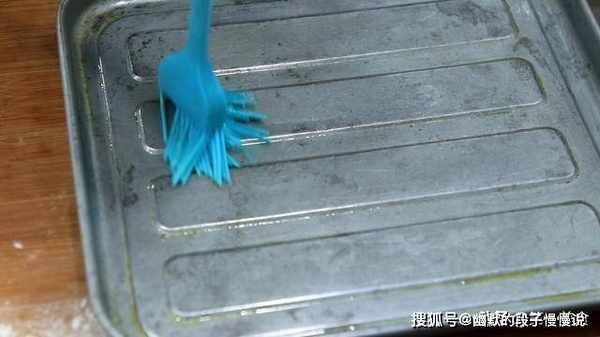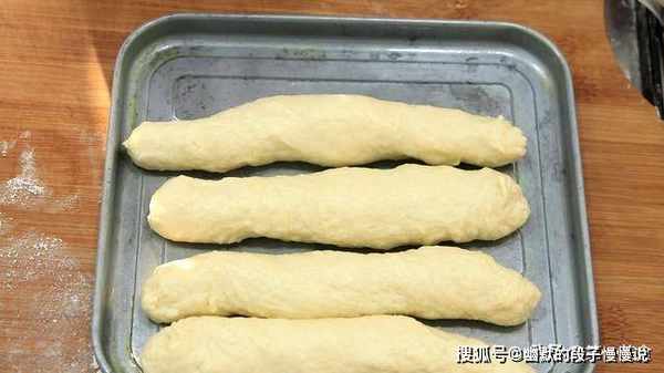 搓揉好以后, 用手抓一个面剂子,搓成一个长条 ,放在烤盘中,烤盘的底部要刷上一层植物油。