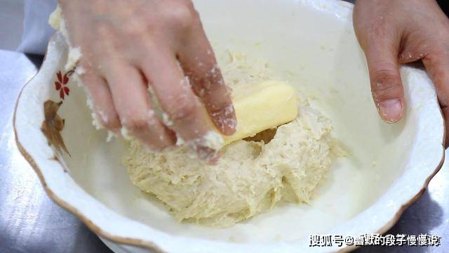 再和成稍微软一点的面团,面团要多揉搓 ,一定要把面团揉出筋以后,加入软化后的普通黄油30克。
