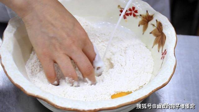 倒入180毫升的纯牛奶一包,先把面粉搅拌成面絮。