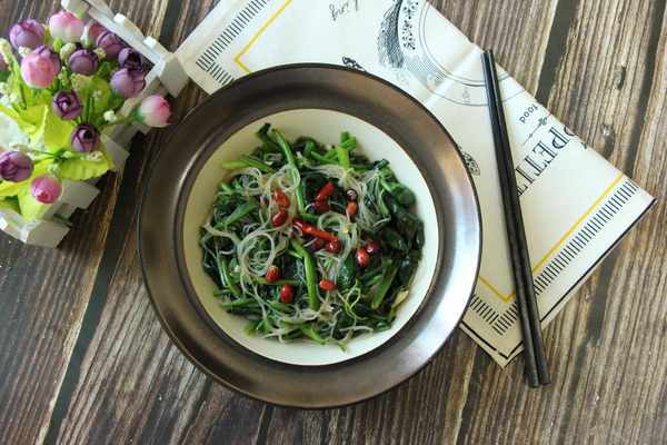 3、粉丝提前用开水烫软,然后放入菠菜盘中,上面放上炸好的花生米。
