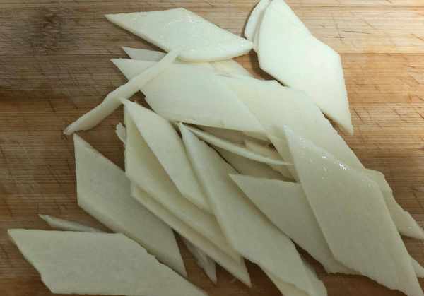 3、戴上一次性手套,先把山药外面的皮剥掉,然后斜切,最后切片。切好的山药片用水泡一下,防止氧化变黑。