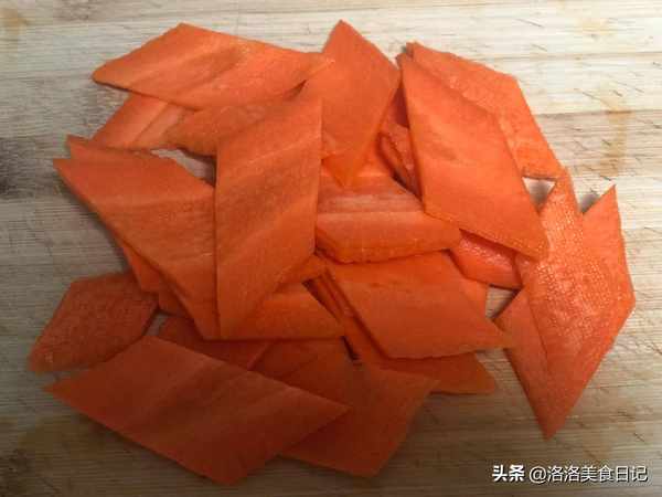 2、胡萝卜去皮洗净斜切,然后将胡萝卜每段再切片一次,就可以切出漂亮的菱形胡萝卜片了。