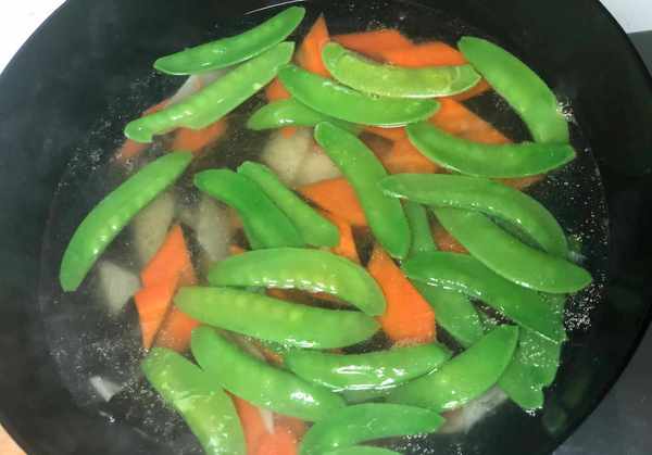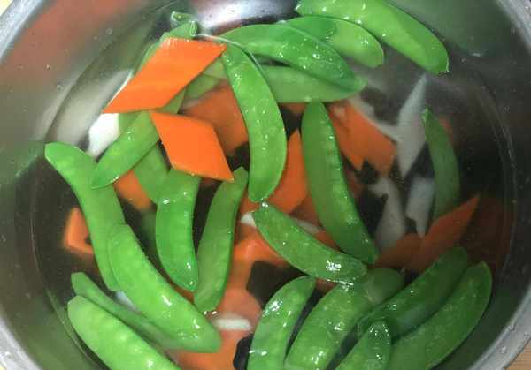6、锅中倒入适量的水,大火烧开,加入适量的盐,再滴几滴花生油。将切好的胡萝卜、木耳、山药、荷兰豆按照成熟程度放入锅中。