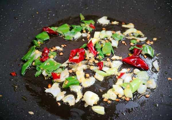 5、小葱洗净切葱花,干辣椒切小块。将少量油倒入煎锅中。油热后,放入炒锅中翻炒出香味。