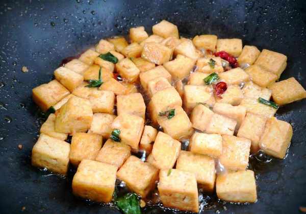 3、锅内倒入适量油,放入豆腐块翻炒片刻,至豆腐表面微黄即可盛出。
