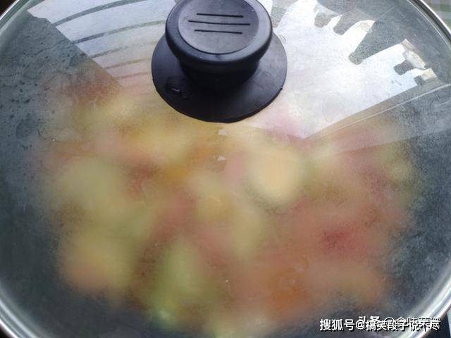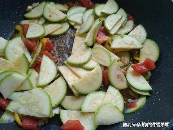 5、加入少量温水,盖锅盖,中火5分钟,让西葫芦断生。