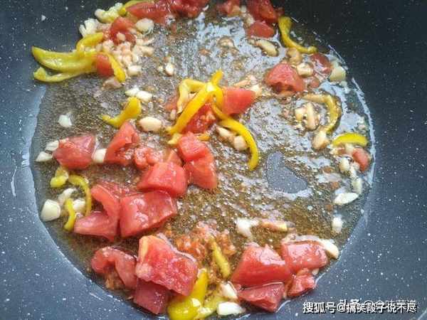3、再放入西红柿继续煸炒,开中火就可以,炒到软烂出汁。