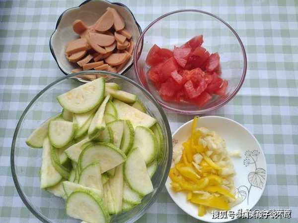 1、准备食材,西红柿1个,火腿适量、西葫芦1个、大蒜2瓣(剁碎一些)、黄青椒适量(切细丝),西红柿烫水去皮也切块儿。