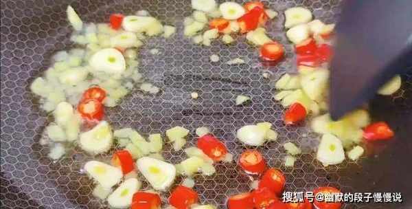 6.锅中倒食用油,油热下蒜末、小米辣、姜末,开大火炒出香味。