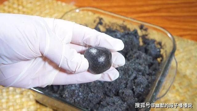 12.接着随手捏出一坨食材,放在手心搓圆,一颗黑芝麻丸就做好了。