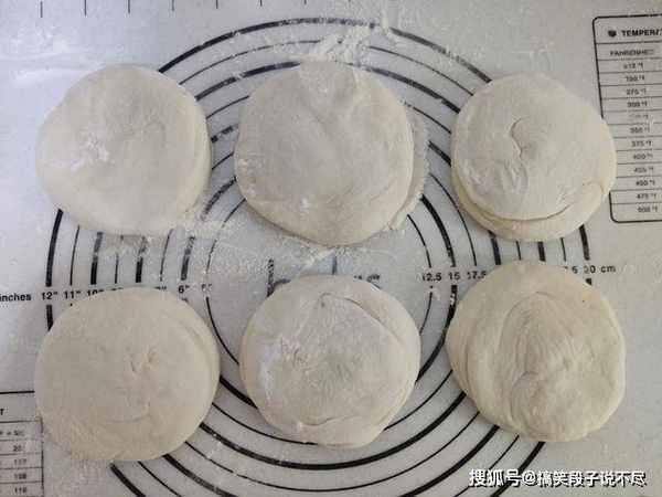 6、卷好之后,再分成均等的面剂,把切口朝上,用掌心轻轻按压,再用擀面杖擀开,不能太用力擀,这一步也是大饼分层的关键,接着就会得到一张大饼生胚了。