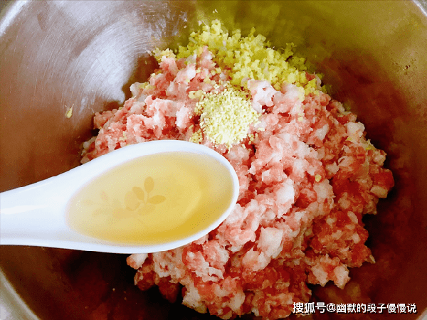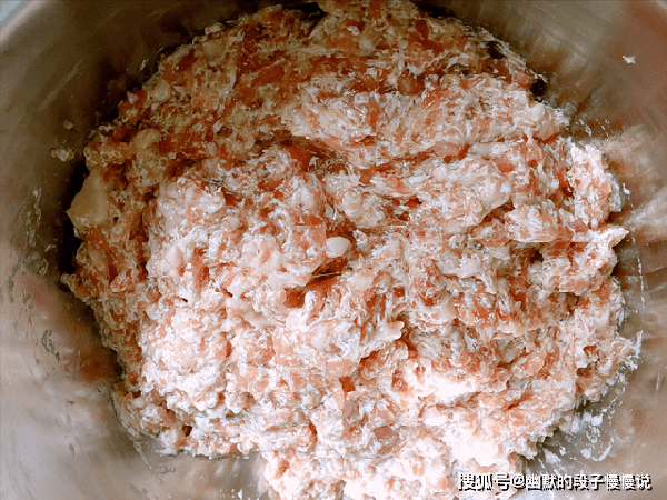 搅拌至完全吸收后,再继续添加下一次,直至完全吸收干净,此时的肉馅很水润,柔软细腻,这样就差不多了,成品一咬就出汁,一点也没有腥味。