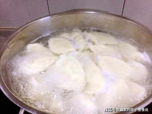 10、起锅烧水,水开下入适量的饺子,保持中大火即可,煮沸腾以后,点入凉水,重复三次,等饺子全部上浮,变得圆滚滚的,表示饺子即可出锅了,一个没破太好了。
