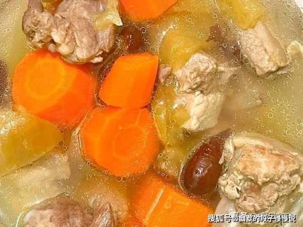 2、将排骨、胡萝卜、苹果和去核红枣都放入锅中,加入适量清水炖煮一个半小时。炖煮好之后,加入食盐调味即可出锅。