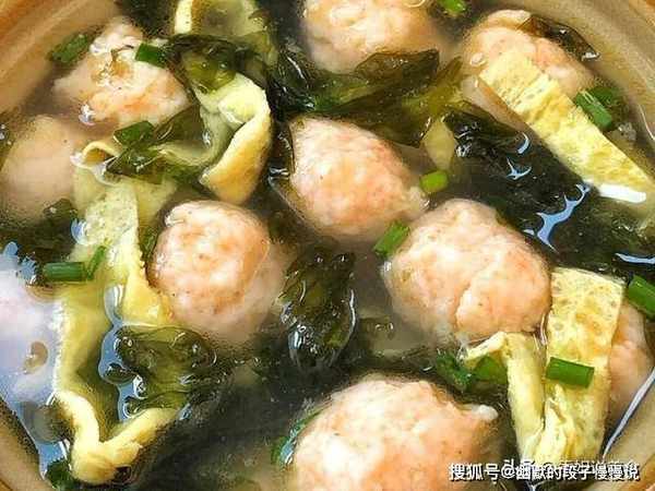 3、起锅烧水,放入一点姜丝,先开大火煮开,再放入紫菜,煮开后再放入团成丸子的虾滑,等虾滑浮起来的时候再放入鸡蛋。