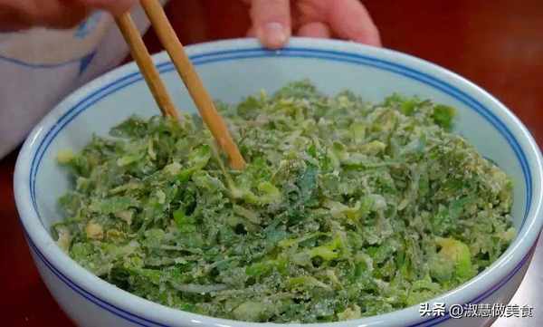 2.荠菜控干水分之后,往里面淋一些油,这样在蒸子的时候不粘也不坨,抓拌均匀后,往里面加入一勺面粉,一勺玉米面,再充分的抓一抓,让荠菜都裹上面粉,然后铺到蒸锅里面,水开以后上锅蒸上六分钟。