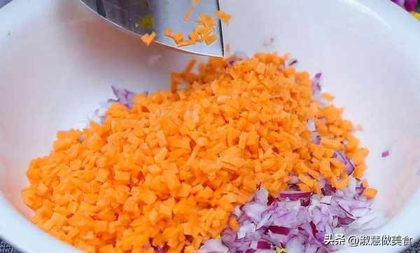 3.准备半个洋葱切成细丝,再改刀切成小丁,切好之后放入大碗中。一根胡萝卜切成小丁,切好跟洋葱放在一起。