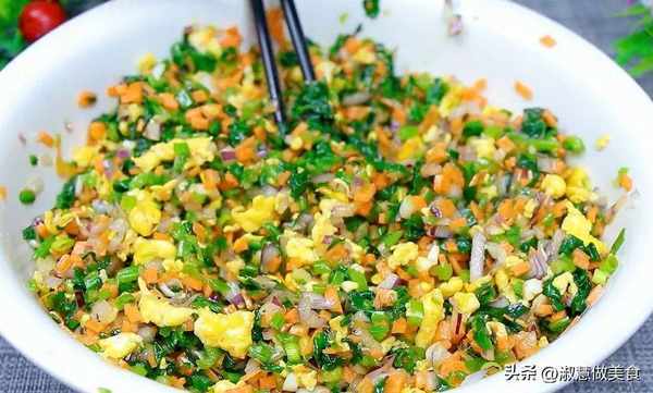 4.再放入切好的菠菜,提前炒好的鸡蛋,加入葱花、盐、花椒粉、一勺蚝油、最后加几滴食用油,用筷子把它搅拌均匀。