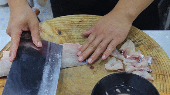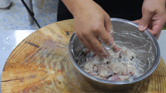 在片好的鱼肉中,加入食盐3克、胡椒粉2克、料酒10克去腥。用手抓匀,直至鱼肉有点黏手的感觉时,放入少许清水。顺着一个方向,把水分打进鱼片里面,腌制十分钟。