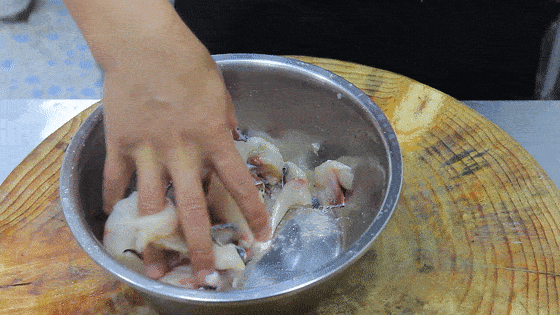 把草鱼宰杀干净之后,先把鱼头剁下来,沿着鱼的脊骨把两边的鱼肉片下来,再把鱼骨剁成小段。鱼头从中间劈开,清洗干净后放在盆里备用。把鱼刺剔下来,鱼肉斜刀片成均匀薄片,放入清水中抓洗干净挤去水分,准备腌制。不喜欢吃草鱼的朋友,这里也可以换成其他品种的鱼类。